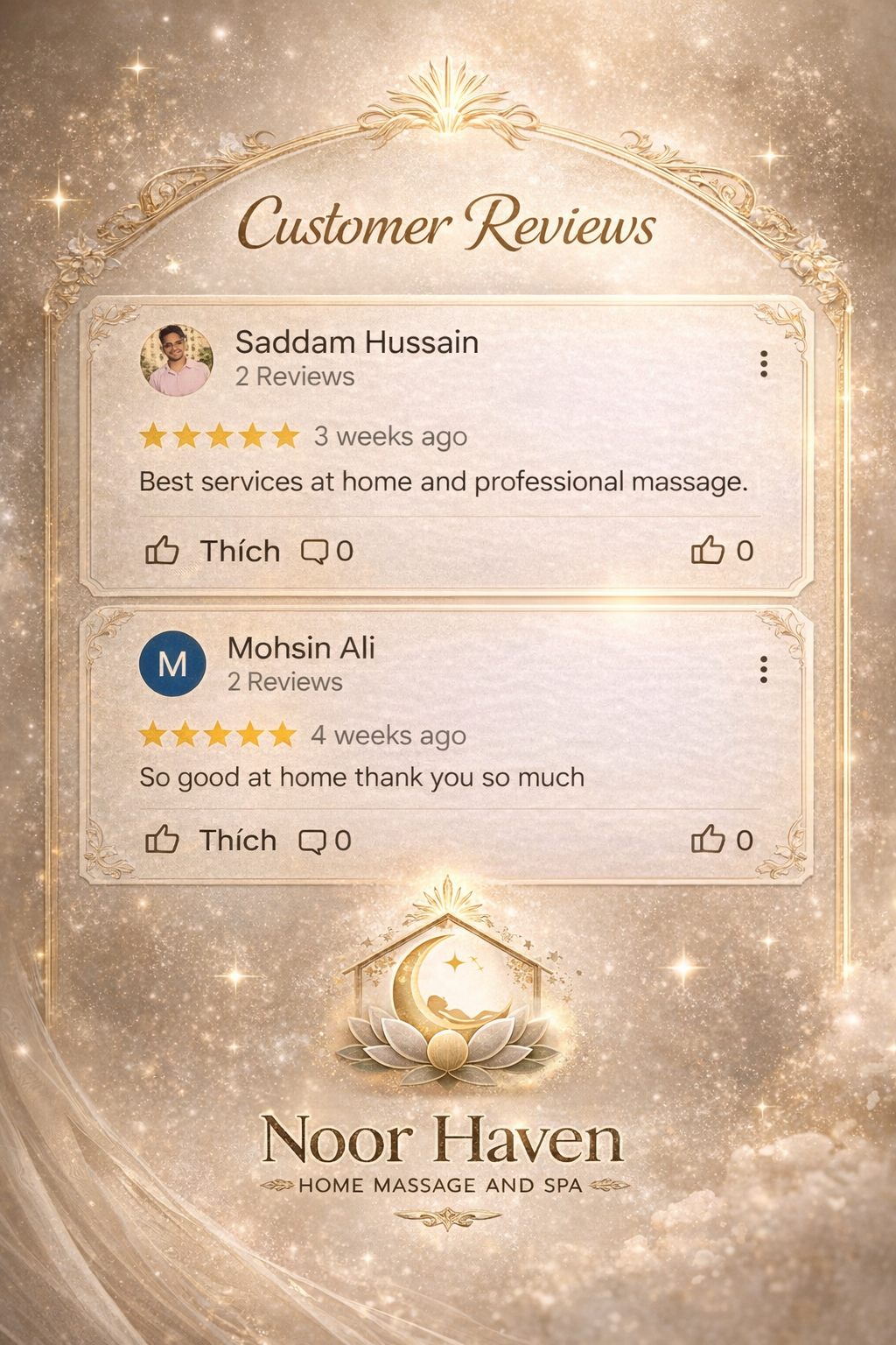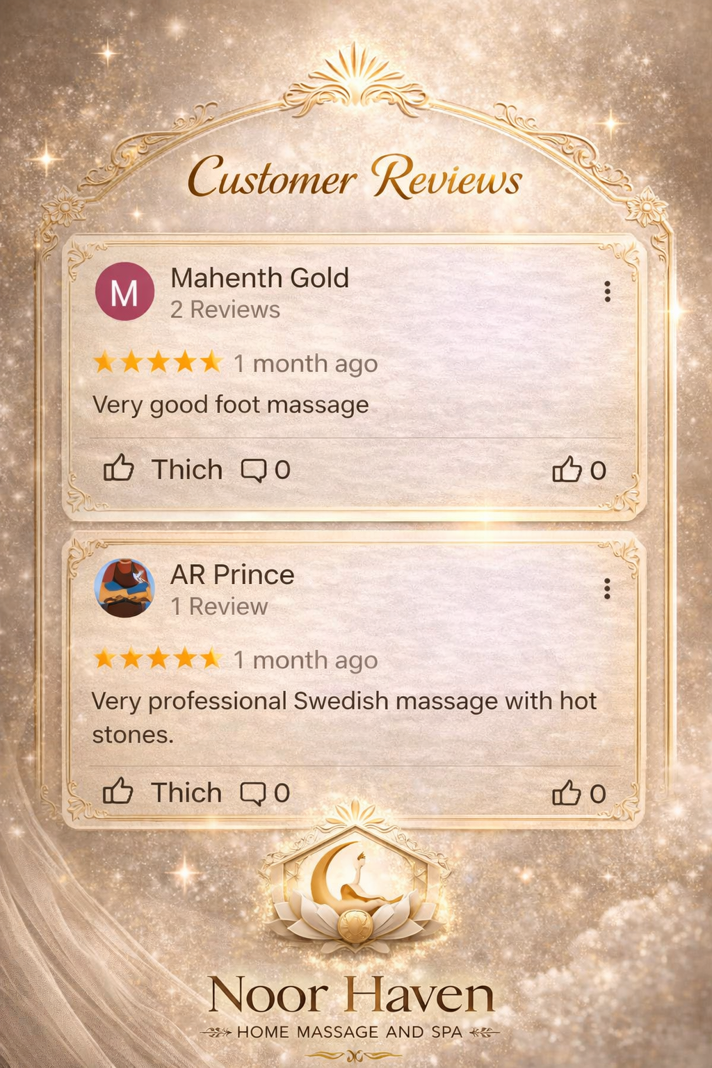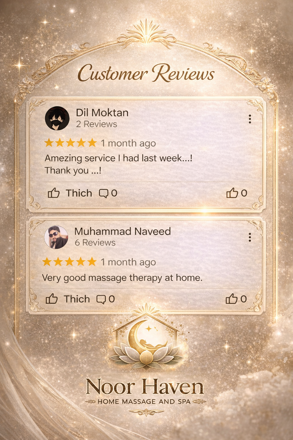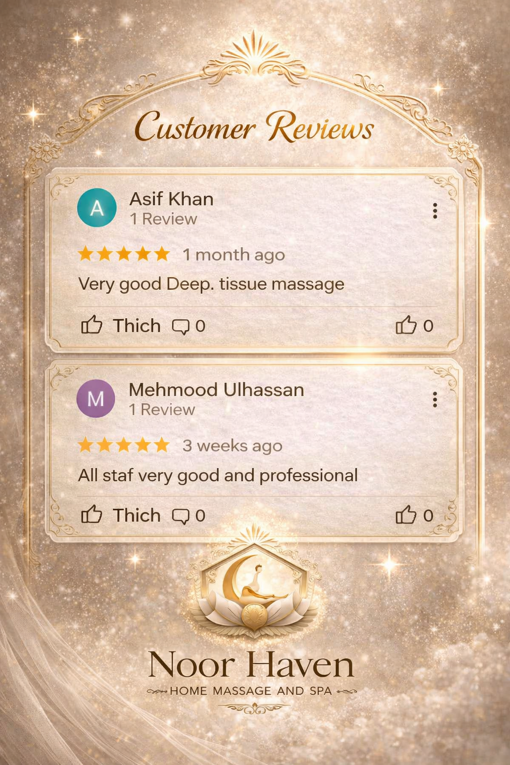 Noor Haven – Home Massage & Spa Established 2024 – Abu Dhabi Founded with a vision to bring world-class wellness into the privacy of your home, Noor Haven offers premium massage and therapy services tailored for women seeking serenity, beauty, and renewal. Despite being a young brand, Noor Haven upholds international standards of care, comfort, and professionalism — earning early trust from clients across Abu Dhabi’s most refined neighborhoods. ✨ More than a service, Noor Haven is your sanctuary of light and healing.