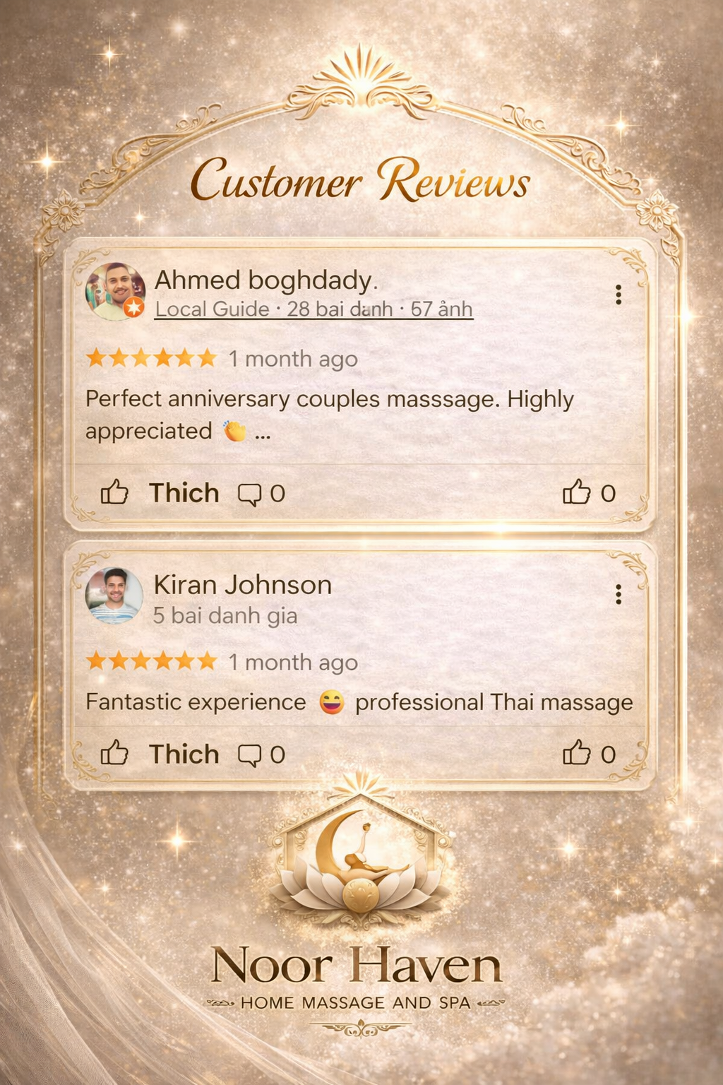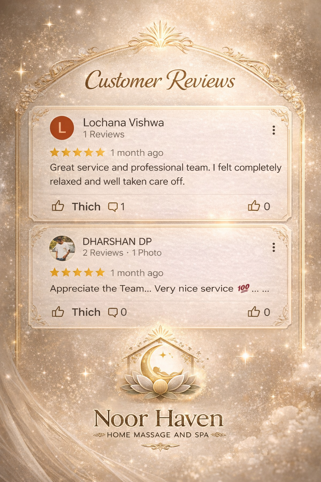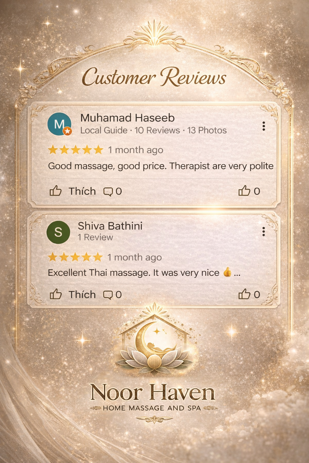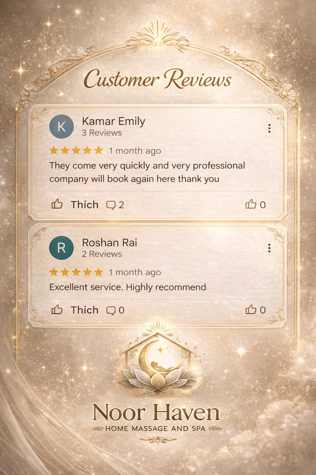 Noor Haven – Home Massage & Spa Established 2024 – Abu Dhabi Founded with a vision to bring world-class wellness into the privacy of your home, Noor Haven offers premium massage and therapy services tailored for women seeking serenity, beauty, and renewal. Despite being a young brand, Noor Haven upholds international standards of care, comfort, and professionalism — earning early trust from clients across Abu Dhabi’s most refined neighborhoods. ✨ More than a service, Noor Haven is your sanctuary of light and healing.